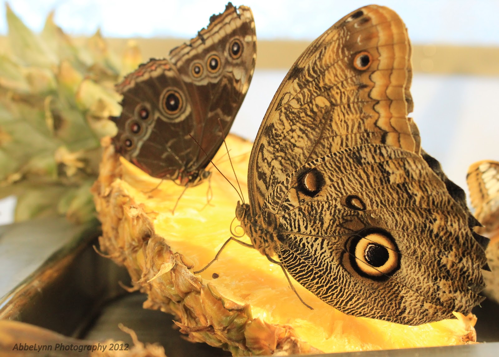 These guys were HUGE! Each one took up about half of the pineapple that they were on; easily larger than my hand. They loved the fruit, but when one did finally take off I saw that the tops (insides) of their wings were a beautiful brilliant blue, but unfortunately I couldn't get a good photo of one in flight.