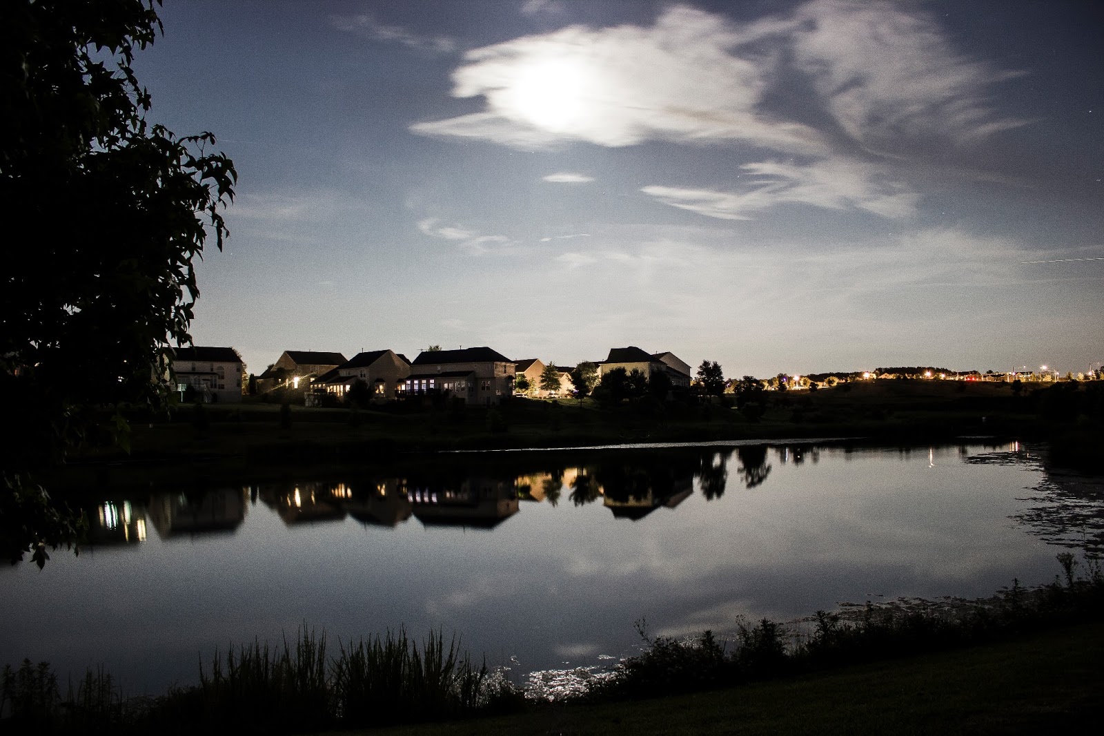 I took these standing on the path around our pond, and wanted to make the most of the entire environment: the bright moon shining in the sky; the moonlight shining off of the pond; the houses and lights on the opposite side. Here's where my tripod really came into play, as I worked with long exposures to capture the entire view. This photo is my favorite of all that I took. 18mm, f/3.5, ISO 400, exposure 1.6s