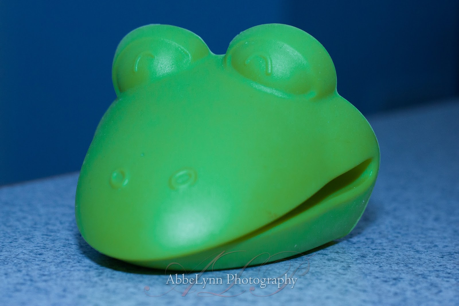 Many of the photos already submitted are landscapes, as everything is just so GREEN right now! I've got a few that I could submit along that vein, but I thought I might try and take something different, specific to the challenge. Our green frog potholder was sitting out on the counter, so I pulled out the camera, my 50mm lens, and external flash and ended up with this fun shot!