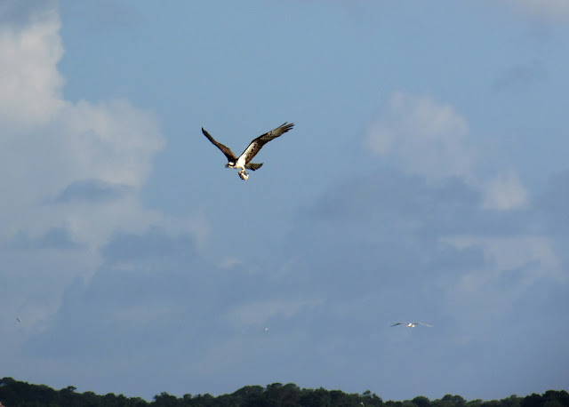 "Dad" came home with a fish for the babies in the nest, and had to circle a number of times to keep the seagull (chasing him in the background) from stealing it away.