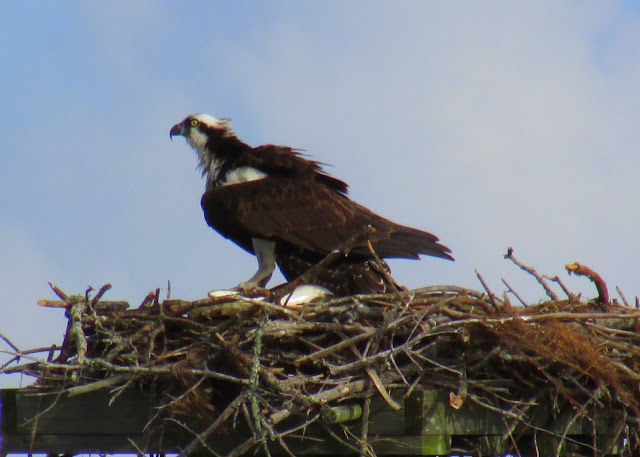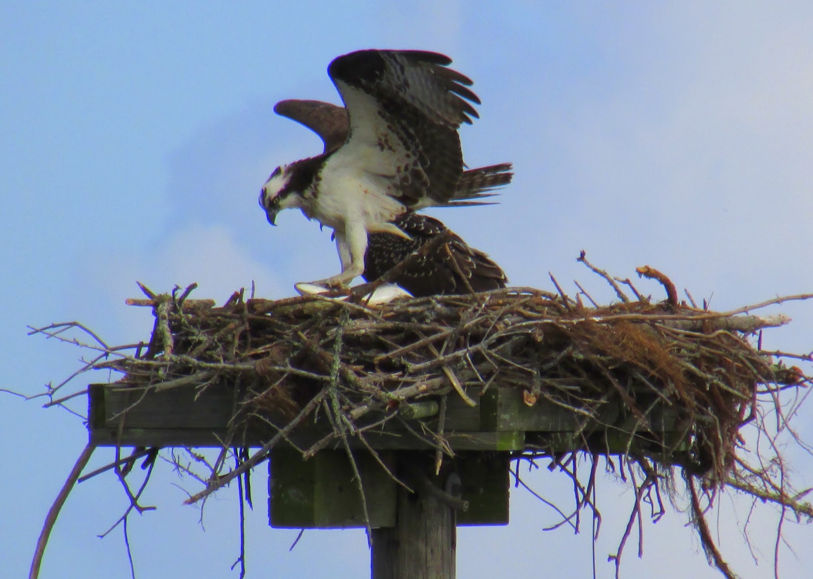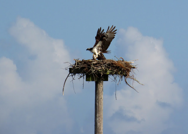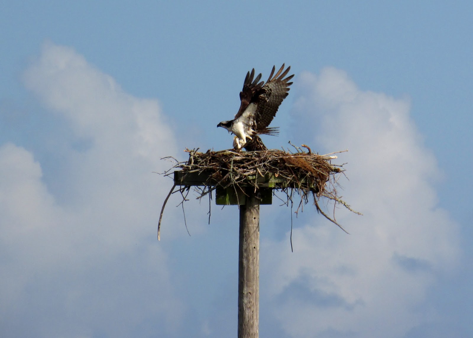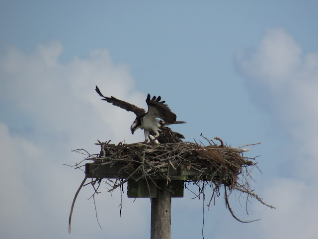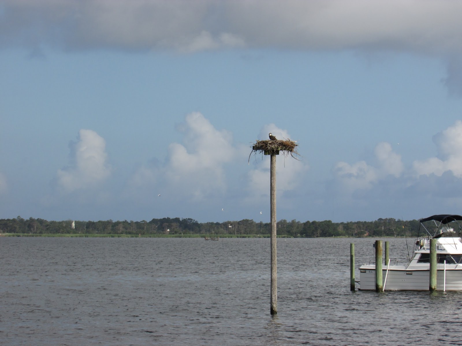 As I mentioned in one of these earlier posts, I went for a walk with my mom and aunt by Kill Devil Bay, part of the Albemarle Sound in the Outer Banks. When we walked out onto a pier, there was an osprey nest nearby that had quite a bit of activity. Note: the pier we were standing on was about 30 yards away from the nest.