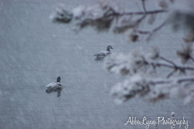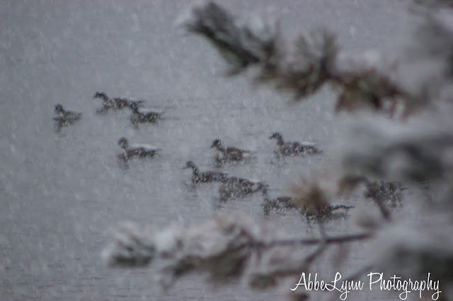 Two weeks ago today, we had the first real snow of the season. It started Monday night (exactly two weeks ago), and when we woke up Tuesday (which also happened to be my daughter's birthday) the snow was thickly coming down. It was too snowy to risk going outside with my camera, but I grabbed a few shots of the snow on the pond with the geese from the safety of my kitchen (using my 70-300mm lens). So beautiful!