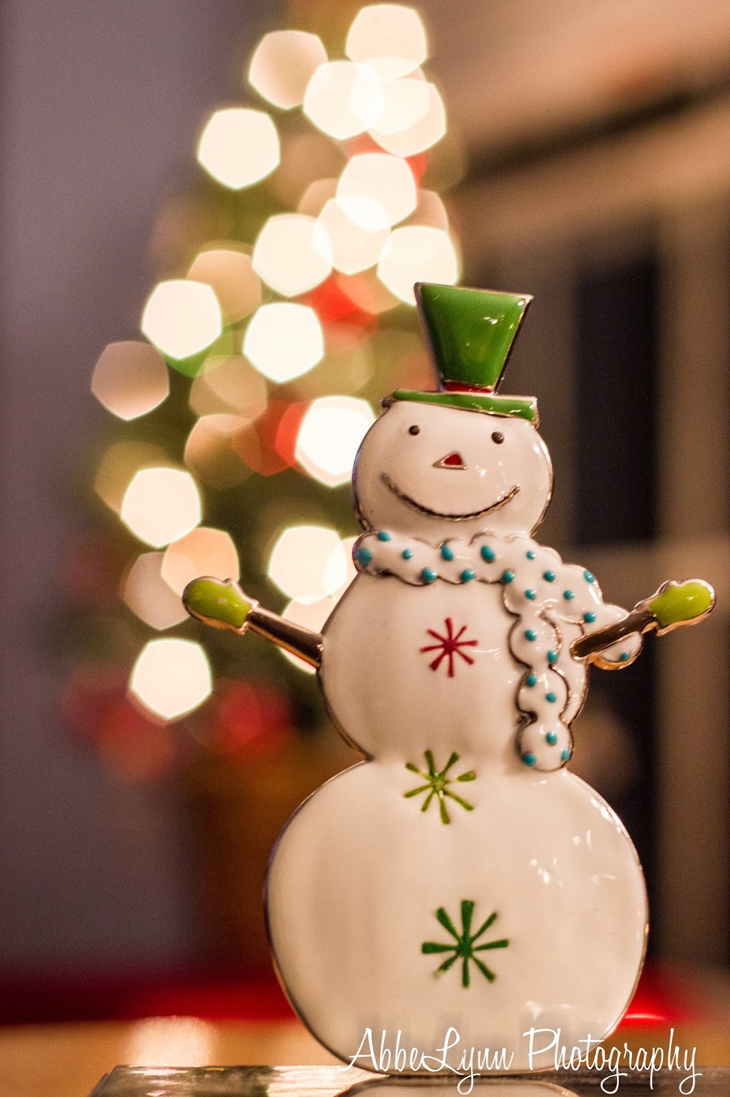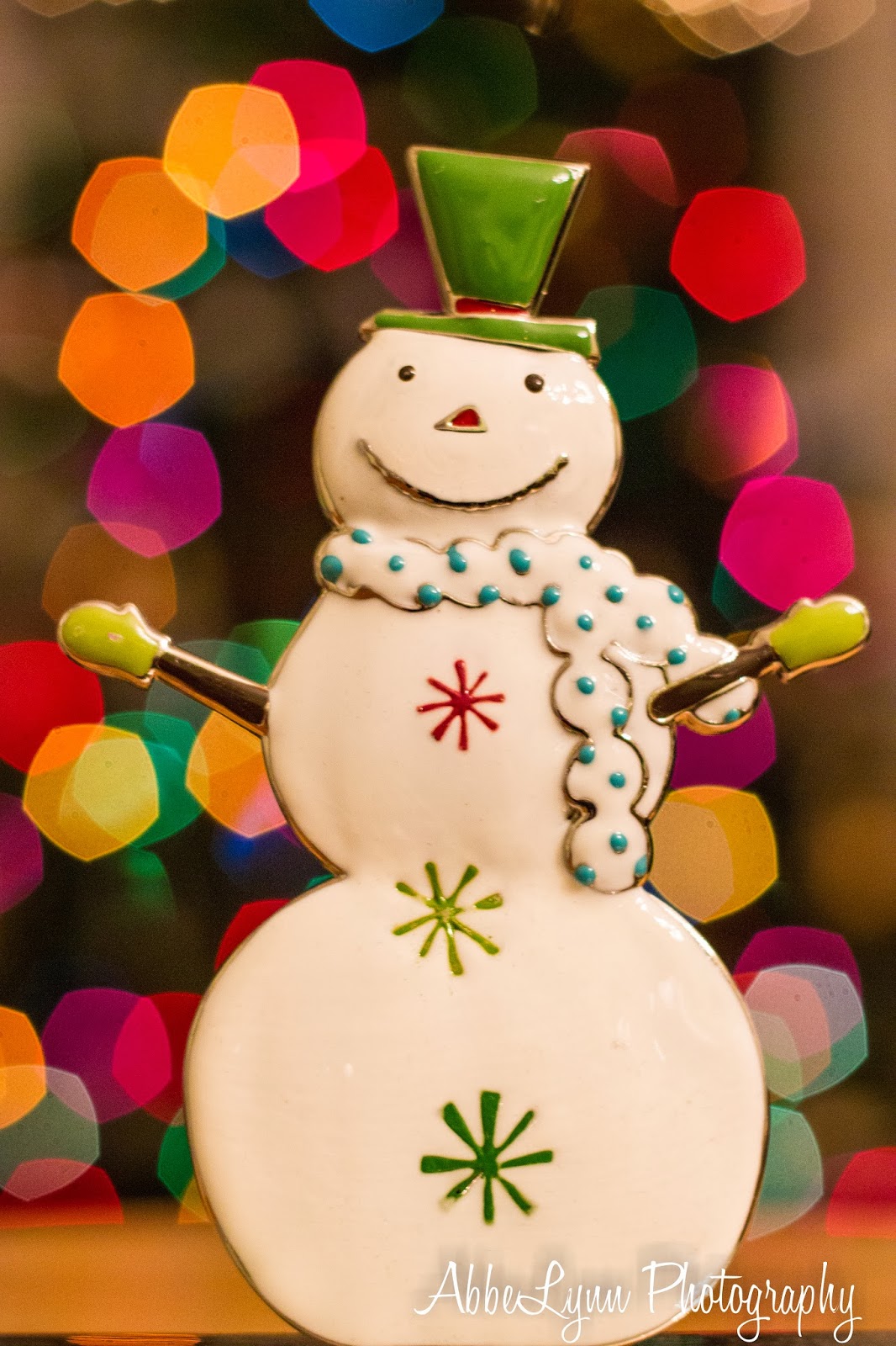 This snowman is one of our stocking holders; I think the photo on the right (in front of the colored lights) is my favorite of all of these!