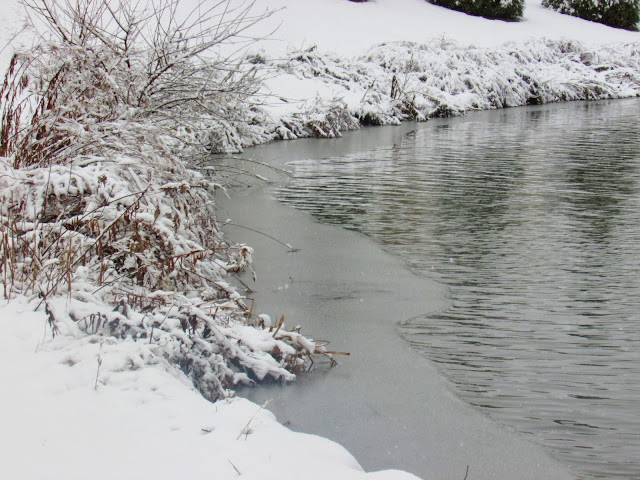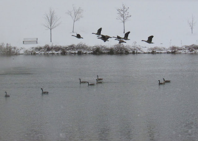 Two weeks ago today, we had the first real snow of the season. It started Monday night (exactly two weeks ago), and when we woke up Tuesday (which also happened to be my daughter's birthday) the snow was thickly coming down. It was too snowy to risk going outside with my camera, but I grabbed a few shots of the snow on the pond with the geese from the safety of my kitchen (using my 70-300mm lens). So beautiful!