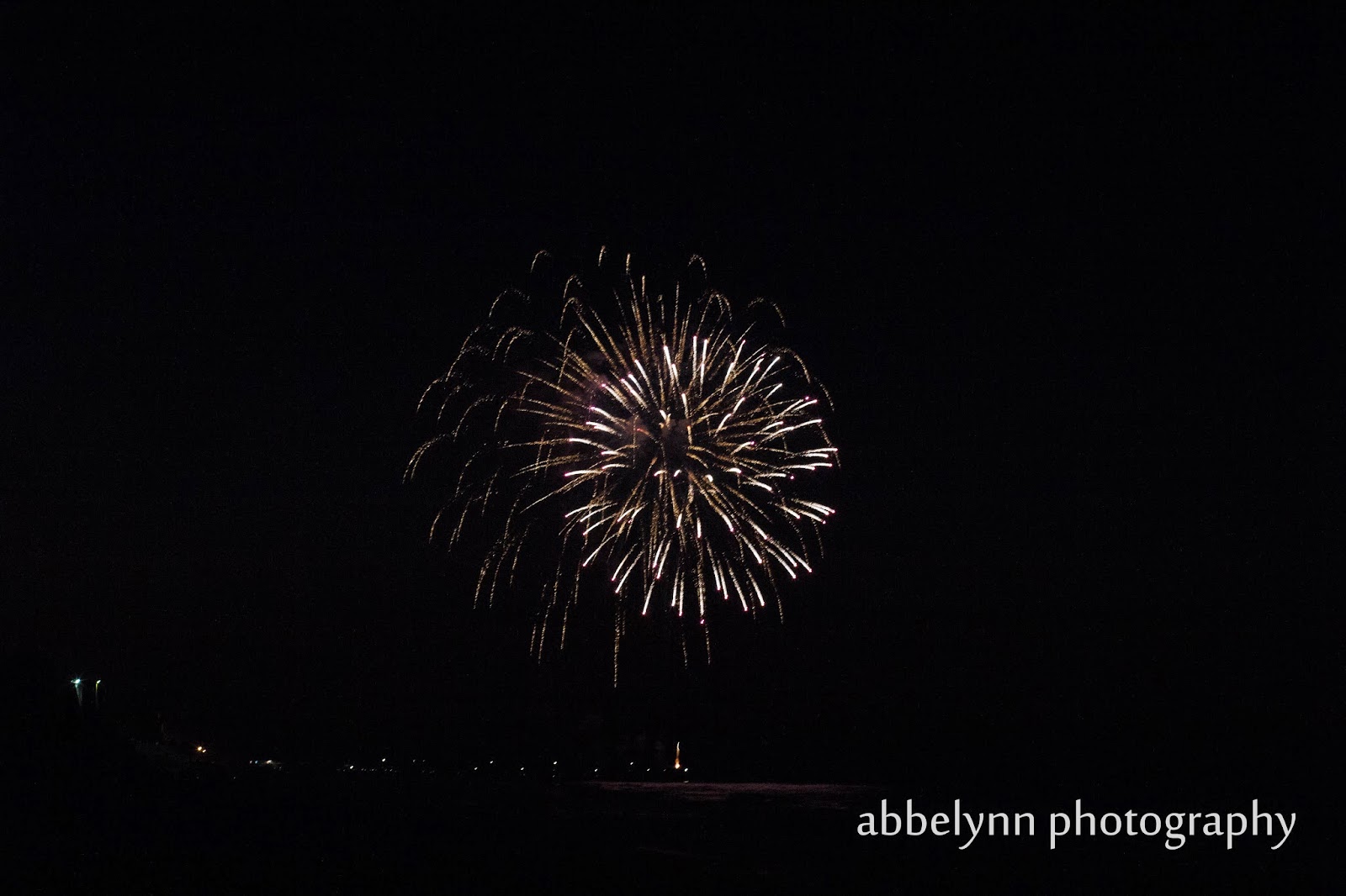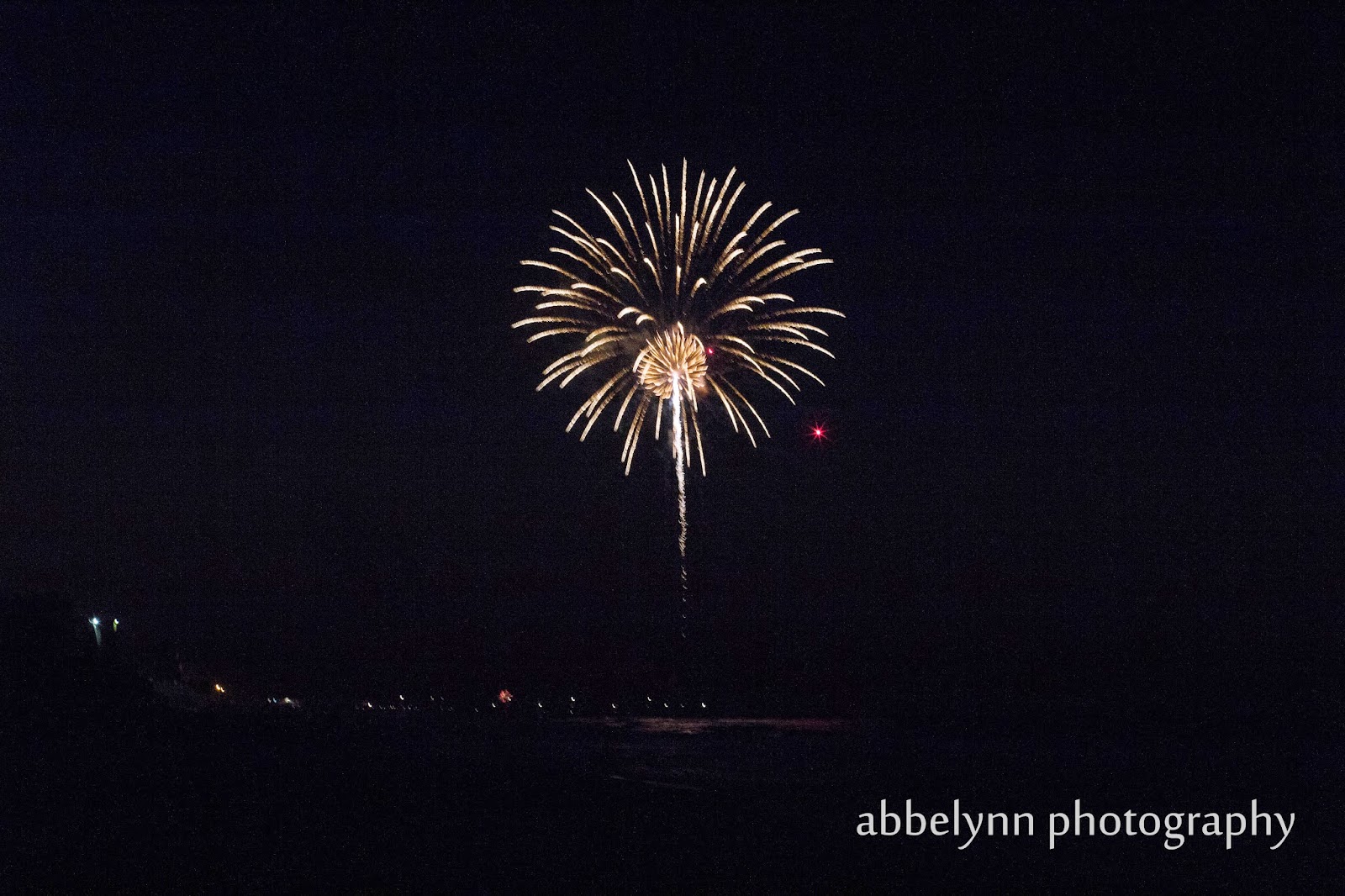 Shortly thereafter, the official fireworks started. These were much further away (at least a mile up the beach), and I had already put my tripod away so as to not interrupt the view of others. I didn't take too many photos, as I was enjoying them with my daughter, but I did get a couple of shots, taken at settings: iso 1000, f/8, 1/20s