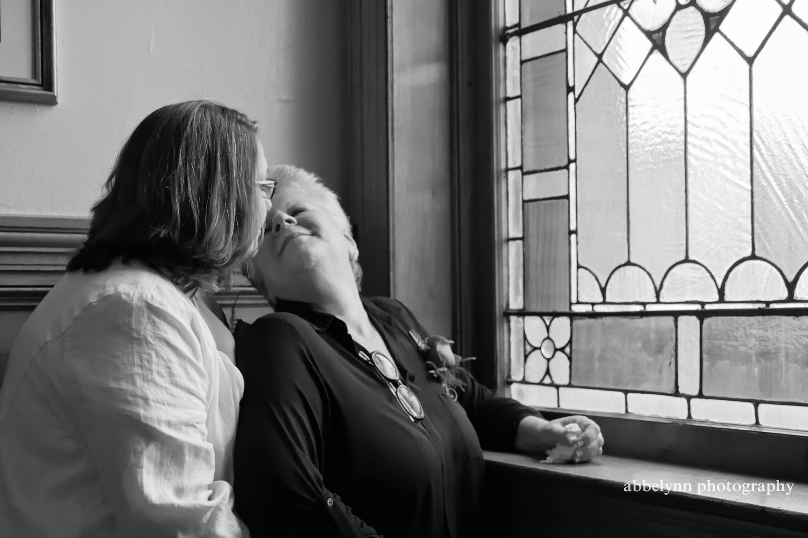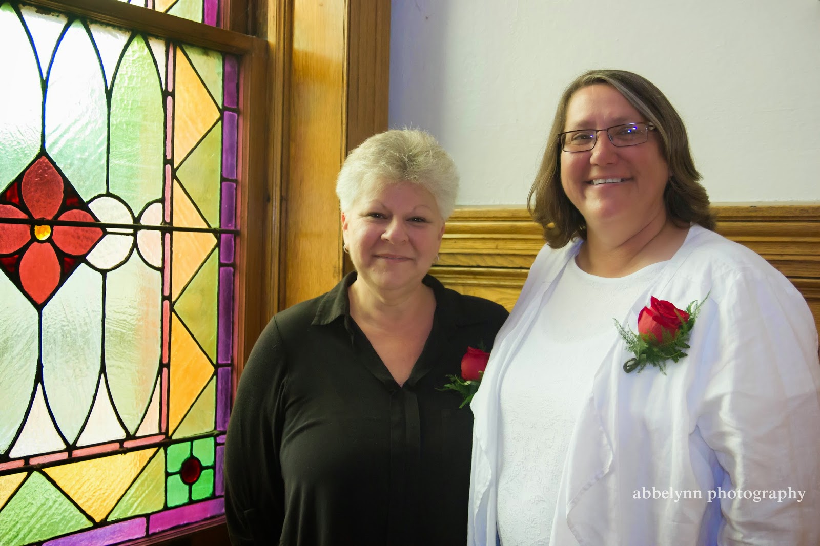 It was difficult to get good photos during the actual wedding, as there were 7 of us in a very small room. However, I saw these beautiful stained glass windows inside of town hall and asked the brides to pose in front of them for me.